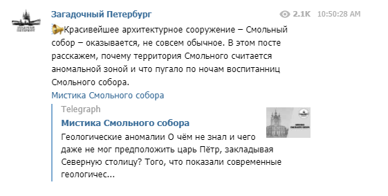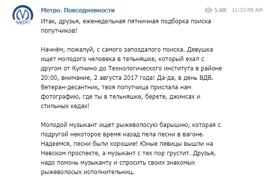 Канал Петербургского метрополитена публикует ответы на популярные вопросы о работе метро, анонсы экскурсий и конкурсов, информацию о станциях в других странах. Раз в неделю здесь появляются объявления о знакомствах в метро.
