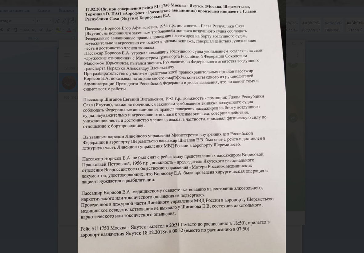 Конфликт произошел в субботу на борту рейса SU 1750, вылетевшего из Москвы с задержкой почти на два часа. В документе, похожем на служебную записку, сообщается, что глава Якутии Егор Борисов вел себя "агрессивно" и угрожал уволить командира воздушного судна и других членов экипажа, пользуясь "дружескими отношениями" с министром транспорта РФ Максимом Соловьевым. Угрозы, по данным очевидцев, Борисов сопровождал попытками дозвониться до главы Федерального агентства воздушного транспорта Александра Нерадько.