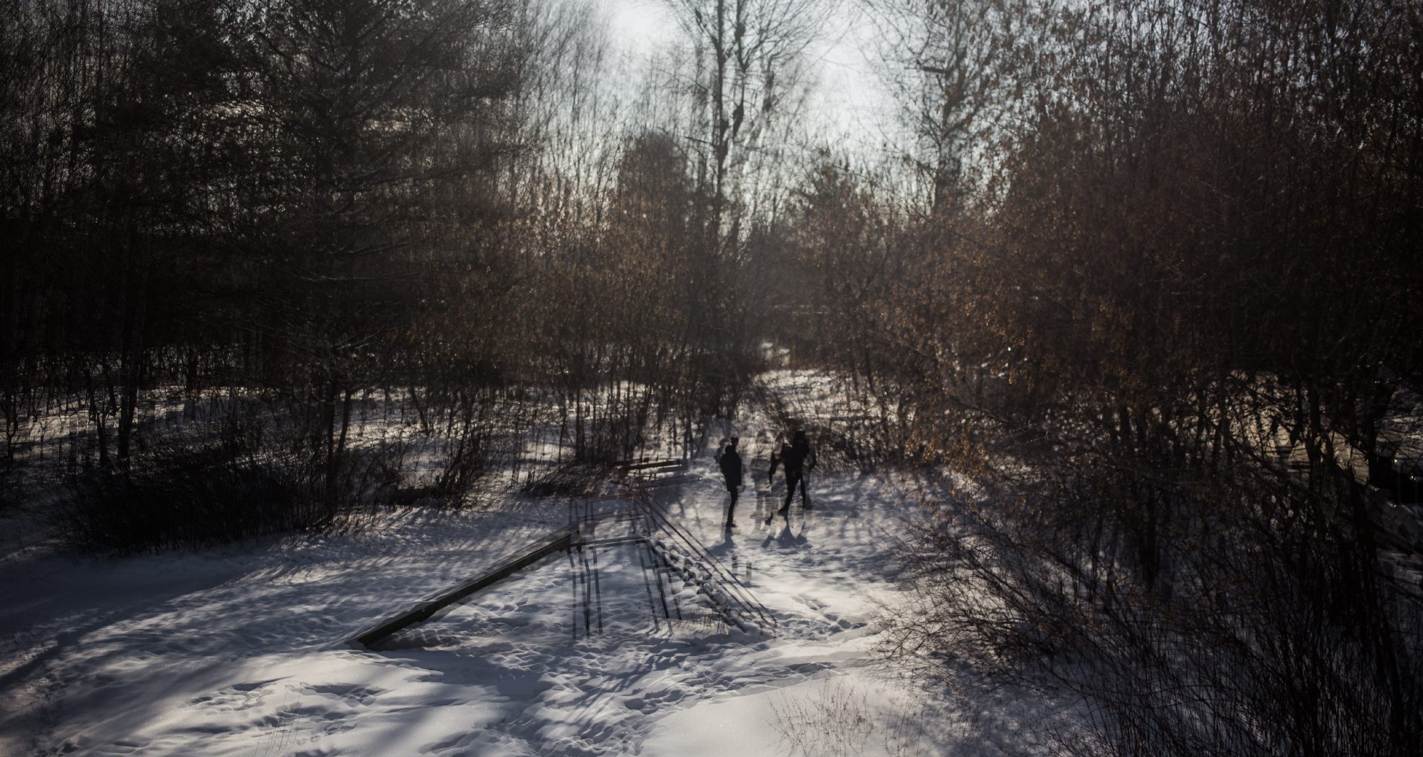 Я иду за Андреем по узкой тропе в пышном снегу: