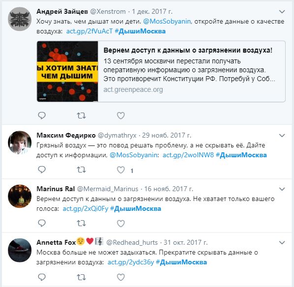 3. Твиттер-шторм за чистый воздух. Осенью 2017 года Гринпис призвал пользователей поучаствовать в твиттер-шторме, чтобы вернуть доступ к данным о качестве воздуха на сайте «Мосэкомониторинга».