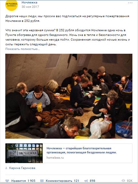 1. 252 рубля. Закрепленный 30 ноября 2017 года пост с просьбой подписаться на регулярные пожертвования благотворительной организации помощи бездомным «Ночлежка» набрал около двух тысяч лайков, около 900 репостов и 92 тысячи просмотров.