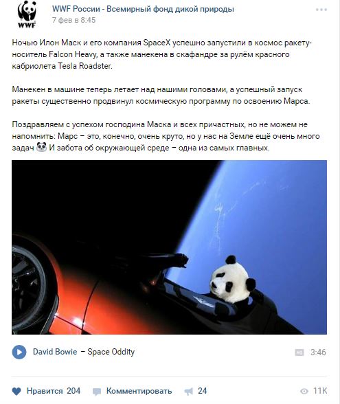 2. Поздравление Илона Маска с запуском SpaceX. Также специалисты фонда активно следят за мировыми новостями, чтобы адаптировать их для своей аудитории. Например, 7 февраля 2018 года, в день запуска ракеты, выведшей на орбиту кабриолет Tesla изобретателя Илона Маска, фонд опубликовал специальный пост с призывом обращать внимание на проблемы на Земле.