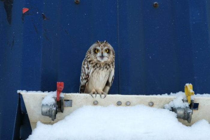 Волонтеры поисково-спасательного отряда «Экстремум» спасли замерзшую болотную сову. Она три дня просидела на железном полуприцепе на территории автомобильного предприятия в Шушарах.