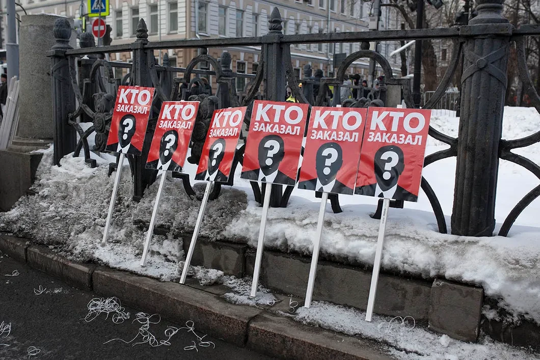 Полиция просит собравшихся не мешать проходу пешеходов на мосту. Но практически все проходящие по мосту — это те, кто приходит туда с цветами. В большой букет красных роз в ведре вставлена табличка «Кто ответит?». Лариса, женщина которая раздает всем красные лампадки, говорит мне, что «пока не будет наказан заказчик, никогда в день убийства здесь не будет пусто».