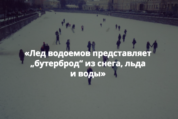 «Ввиду таких перепадов лед водоемов представляет из себя некий „бутерброд“ из снега, льда и воды, а вовсе не крепкий монолит», — говорится в сообщении ведомства. По словам спасателей, надежность льда можно определить визуально: темный прозрачный лед, образованный от замерзания верхнего слоя воды, самый крепкий; «ноздреватый», серого или беловатого цветового оттенка менее надежен.