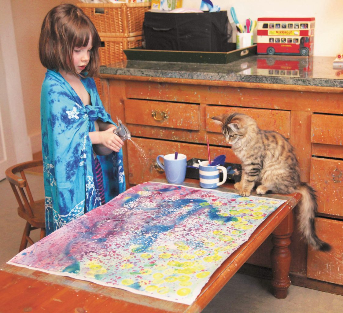 Я решила поменять всего одну деталь: карандаши на краски, а все остальное оставить неприкосновенным: от нахождения в детской до безопасно прикрепленных к столику обоев. Вместе с мольбертом пришлось убрать пластиковые баночки, заменив их обычными кружками, более устойчивыми и привычными для Айрис. В следующий раз, на всякий случай прикрыв мебель в детской старыми простынями, я поставила на столик наполненные краской кружки, позволив дочери самой решать, когда заняться рисованием. Долго ждать не пришлось: вскоре белый лист стал разноцветным. Айрис рисовала очень аккуратно: причудливая смесь непринужденности и продуманности. Делая мазки, она использовала множество техник: цветные завитки, зигзаги, пятна и точки. Удивительно, но она почти ничего не пролила на пол и совершенно ничего — на себя.