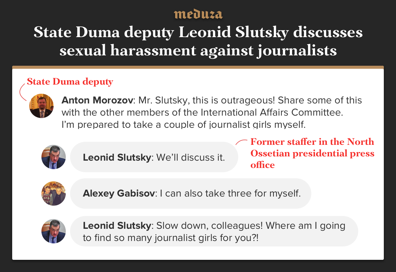 Dozhd journalist Yelizaveta Antonova, who wrote the first report about Slutsky allegedly harassing women reporters at the Duma, refused to discuss the meeting with Meduza. Vadim Marshalko and Konstantin Tarasov, who heads the Duma’s public relations department, both ignored Meduza’s phone calls.