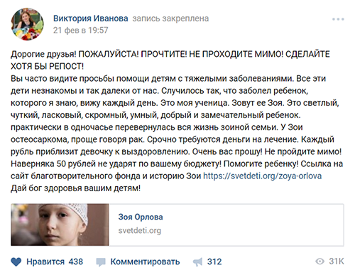 Когда мама Зои рассказала мне обо всем, вопроса «помогать или нет» не возникло. Я попросила разрешения на то, чтобы развернуть какую-то деятельность, и она ответила, что будет благодарна. У нас с классом есть группа во «ВКонтакте», там я написала о Зое. Родители отреагировали моментально: стали звонить мне, спрашивать, чем можно помочь, писали посты в различных группах и у себя на стене. У себя во «ВКонтакте» я написала пост про Зою, сейчас у него 30 тысяч просмотров и больше 300 репостов.