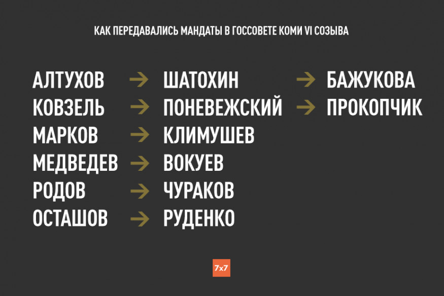 С момента избрания депутаты Государственного совета Коми VI созыва ни разу не собирались на заседания в полном составе — некоторые отсутствовали из-за болезни, командировок или находились под арестом, другие слагали с себя полномочия. Нынешний созыв отличается от предыдущих и серьезной кадровой ротацией: за два с половиной года успели побыть депутатами 13 человек. Кто лишился мандата и кто занимал места выбывших — в обзоре «7x7».