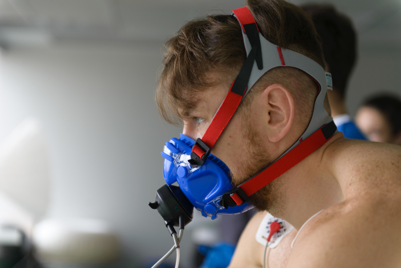 Спортсмен дышит в газоанализатор. Фото: Мария Можарова