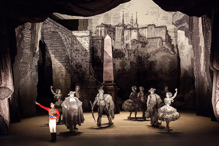 Первый акт — «балет XIX века», «старое искусство»: действие подлинника Петипа разворачивается в условной Испании, екатеринбургской постановки — в пространстве гравюры XIX века, в «Испании» Гюстава Доре (сценография — Альона Пикалова). В финале первого акта, когда место танцовщиков в одно мгновение занимает стаффаж, в «логике перемен» спектакля возникает еще один важный референс: игрушечный «бумажный театр» для домашних представлений на столе, услада театралов XVIII—XIX веков, стандартный «комплект поставки» которой открывал широкий простор для игры фантазии с миниатюрной коробкой сцены, декорациями, задниками, кулисами и, конечно, с картонными фигурками «актеров».
