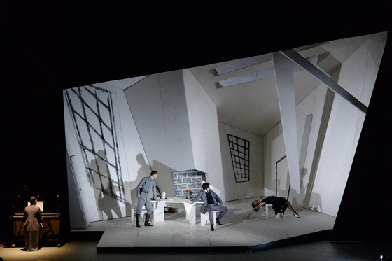 Второй акт — 1920-е, «новое искусство», сеанс немого кино под живой аккомпанемент тапера (виртуозная и с чисто музыкальной, и с актерской точки зрения работа пианиста Германа Мархасина). Искаженные пропорции павильона напоминают о дизайне «Кабинета доктора Калигари» — и это отнюдь не просто культурологический стеб, но красивая гипотеза: язык «великого немого» как прямой наследник пантомимы балетного театра XIX века.