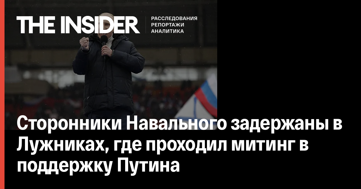 В Лужниках, где проходил митинг в поддержку Владимира Путина, задержали нескольких сторонников Алексея Навального. Об этом сообщает «ОВД-Инфо» со ссылкой на координатора штаба Навального в Королеве Алексея Голышева.
