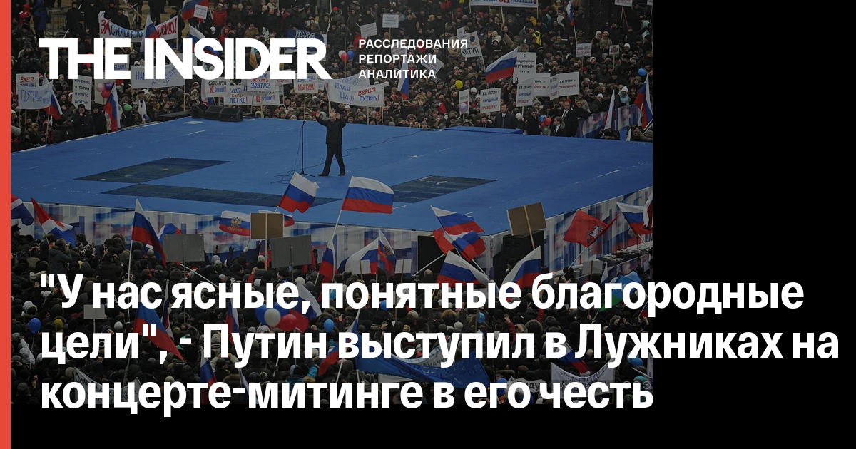 «Всех приветствую, кто собрался здесь, в Лужниках. Это уже не «Лужа», как говорили несколько лет назад. Это наши знаменитые Лужники, которыми мы гордимся. Я приветствую всех, кто собрался здесь на митинг за сильную Россию», — сказал Путин. Президент спел гимн России вместе с присутствующими на митинге эстрадными исполнителями и спортсменами.
