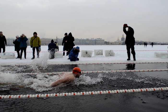 У Петропавловской крепости прошли соревнования по плаванию в ледяной воде