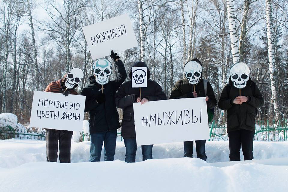 "Мертвые увидели агитку, призывающую прийти на выборы и "доказать, что ты живой", сделав селфи на избирательном участке с хештегами #яживой и #мыживы в Новгородской области. В ответ на это мертвые вышли пикетировать кладбище, держа плакаты с такими же точно хештегами".