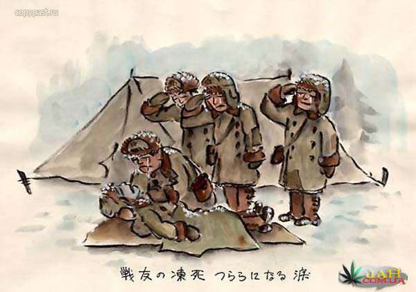 Киутси Набуо потом написал серию рисунков на эту тему – они не плаксивые, с юмором, и все же передают те невзгоды, с которыми им пришлось столкнуться в тот период. А тогда погибли десятки тысяч человек.