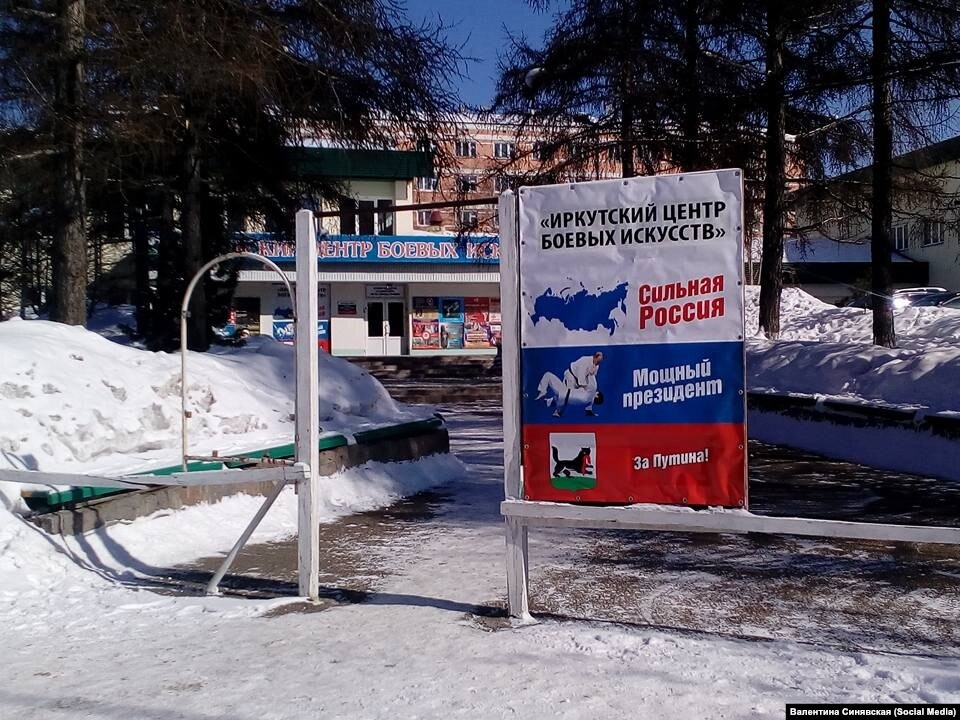 Жители Иркутска сообщили, что центр боевых искусств незаконно разместил баннер в поддержку действующего президента России Владимира Путина. Агитационный плакат был размещен повторно – неделю назад сотрудники центра убрали другой баннер после того, как его отметили на "Карте нарушений" общественного движения "ГОЛОС".