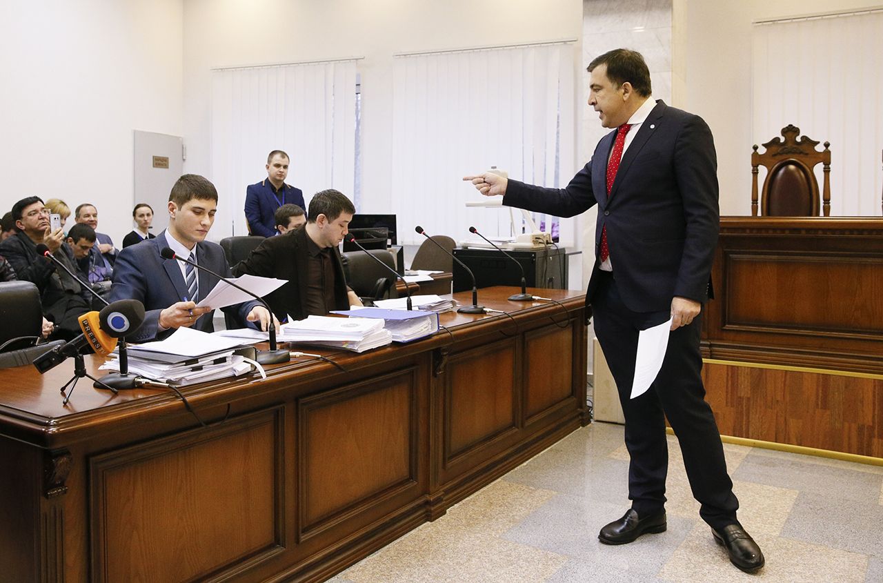 Валентин Огиренко / Reuters / Scanpix / LETA Саакашвили обращается к стороне обвинения в киевском суде, 11 января 2018 года. Речь на заседании шла об избрании меры пресечения для политика, которого обвиняли в получении денег от Сергея Курченко «с целью захвата государственной власти в Украине»