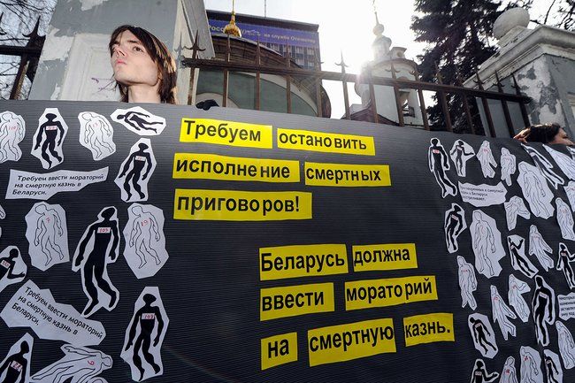 Andrey Smirnov / AFP / Scanpix / LETA An Amnesty International demonstration in front of the Belarusian embassy in Moscow, April 2013. The sign reads, “We demand an end to death penalties! Belarus must establish a moratorium on capital punishment.”
