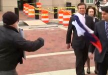 Флаг бросил мужчина, державший в руках плакат с надписью "Кровавые деньги". "Это твой флаг! Предатель!" - крикнул он и громко поинтересовался, сколько Манафорту заплатили за "продажу Америки русским". Экс-руководитель штаба Трампа никак на это не прореагировал, быстро сел в автомобиль и уехал.