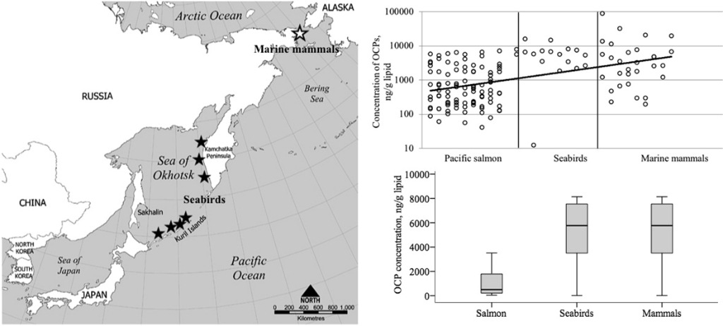 Исследователи заметили общий высокий уровень концентрации хлорорганических пестицидов в органах морских птиц и животных, при этом у млекопитающих уровень выше, так как у них больше жира в организме.