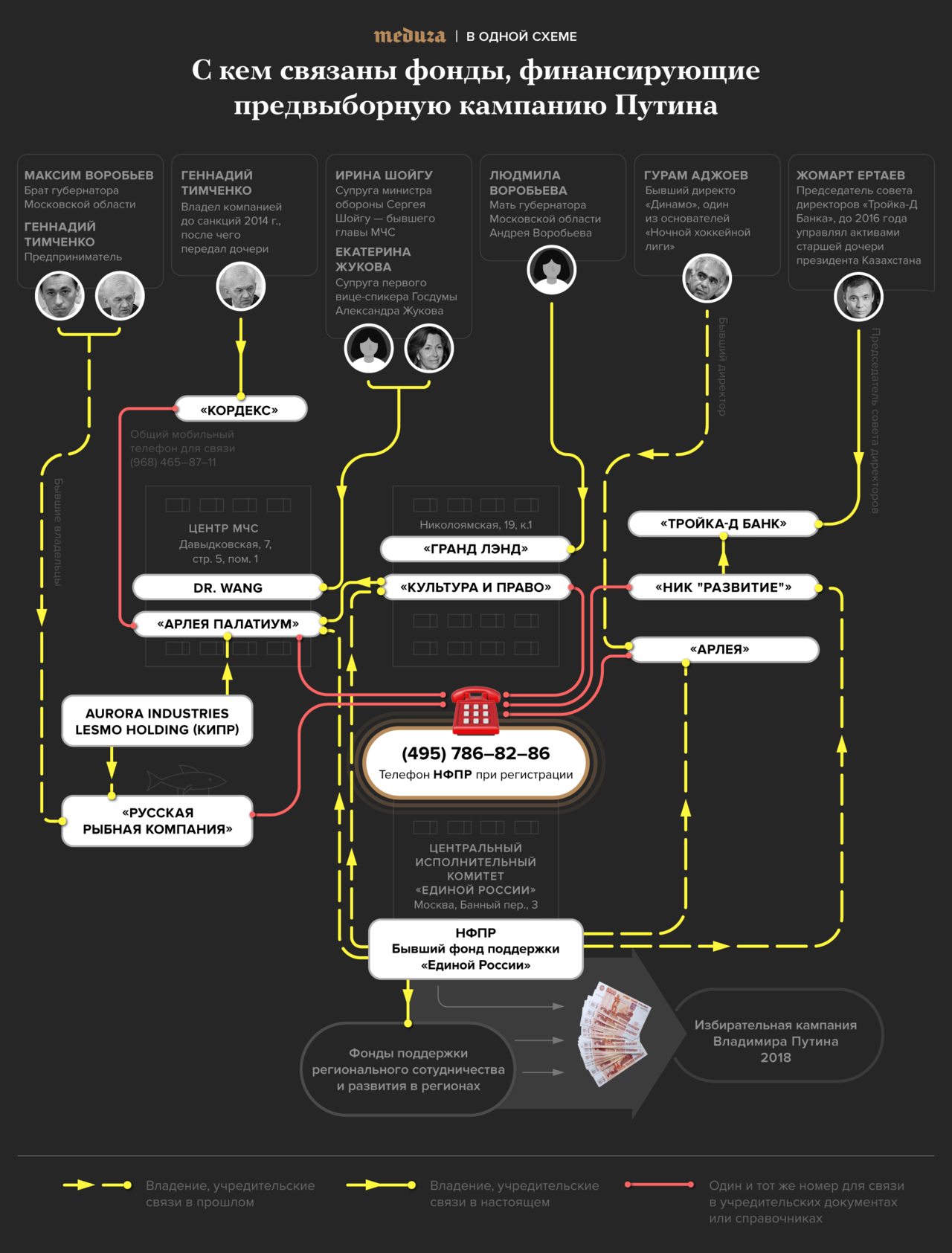 Предвыборную кампанию Владимира Путина через непрозрачную сеть бывших фондов «Единой России» финансировали структуры, связанные с бизнесменом Геннадием Тимченко, членами семьи Сергея Шойгу и губернатора Московской области Андрея Воробьева, выяснил журналист и участник Центра по исследованию коррупции и организованной преступности OCCRP Роман Шлейнов в расследовании, опубликованном «Медузой».