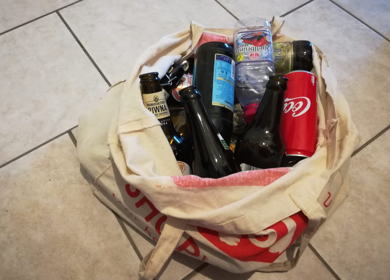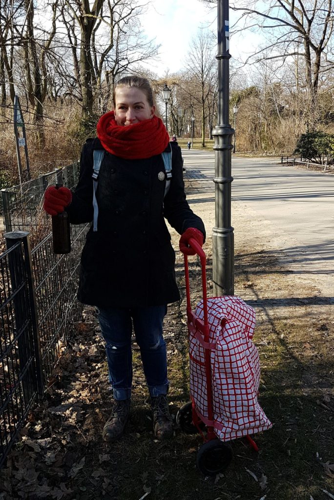 В сумку я предусмотрительно вставила большой пакет для мусора (и ох, как же это было правильно!), но в итоге оказалась с друзьями почему-то именно на Александер Платц. Наша цель была — заполнить сумку на 42 литра бутылками доверху и посмотреть, сколько у нас уйдет на это времени и сколько мы заработаем. На самой площади мы нашли только пару самых дешевых восьмицентовых бутылок из-под пива и двинулись в сторону парка, на который я возлагала большие надежды. По дороге к парку мы заполнили сумку-тележку примерно на треть. Я так и не смогла перебороть себя и залезть в мусорку, но в этом, объективно говоря, и не было нужды. Пустые бутылки обычно стоят рядом с мусоркой, на обочине дороги. Кстати, об этом даже пишут в местных газетах: просят не бросать бутылки в мусорки, а оставлять рядом, чтобы собиратели бутылок не копались в мусоре. Я честно заглядывала во все мусорные баки по дороге, но бутылку заметила только в одном.