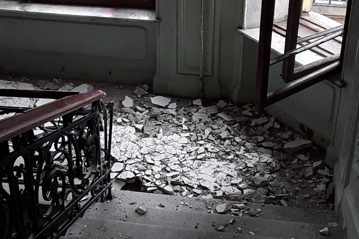 В доме Бака из-за работ сотрудников ЖКС обрушился потолок, а также были повреждены кованые ограждения лестницы. Об этом сообщили жильцы дома-памятника.