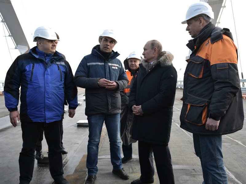 Аркадий Ротенберг — глава компании «Стройгазмотаж», которая является генподрядчиком строительства, — сообщил российскому лидеру, что автомобильная дорога по Крымскому мосту должна была по плану открыться в декабре, но «в мае будет готова». Железнодорожное сообщение по Крымскому мосту должно начаться в конце 2019 года.