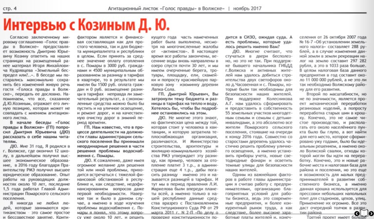 Основная часть интервью Дмитрия Козина, которое опубликовала партийная газета КПРФ, посвящена достижениям районного и регионального правительства и «Единой России».