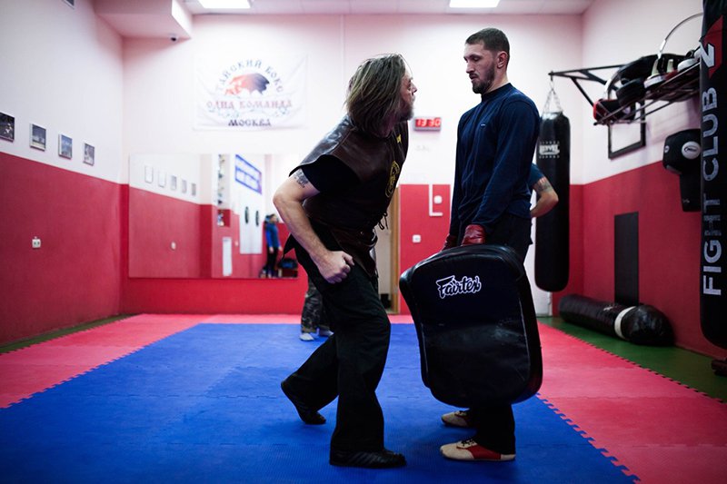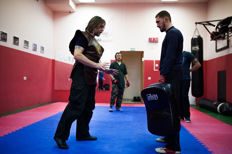 Из подвала спорткомплекса раздаются мясистые шлепки и тяжёлое дыхание. В небольшой комнате, примыкающей к тренажёрному залу, в который мы спустились, вдоль одной стены развешаны будто никогда не битые груши, вдоль другой стоят скамейки. Под ногами чистые красные маты, всё пахнет резиной и новизной. Без какой-либо экипировки в зале занимаются четыре человека: три крепких и подтянутых парня, почти неотличимых друг от друга — вылитые братья, только футболки разные, — и пухлый юноша с неаккуратной растительностью на лице, одетый в военную гимнастёрку и треники. Внешне всё это ничем не отличается от обычной тренировки по боевым искусствам, разве что названия приёмов здесь переименованы «под старину»: лоукик — подколюжная подсечка, прямой удар ногой в лицо — соколик и так далее. Ведёт тренировку поджарый мужчина с аккуратной бородкой, поодаль на скамейке его жена конспектирует рекомендации супруга ученикам в тетрадь.