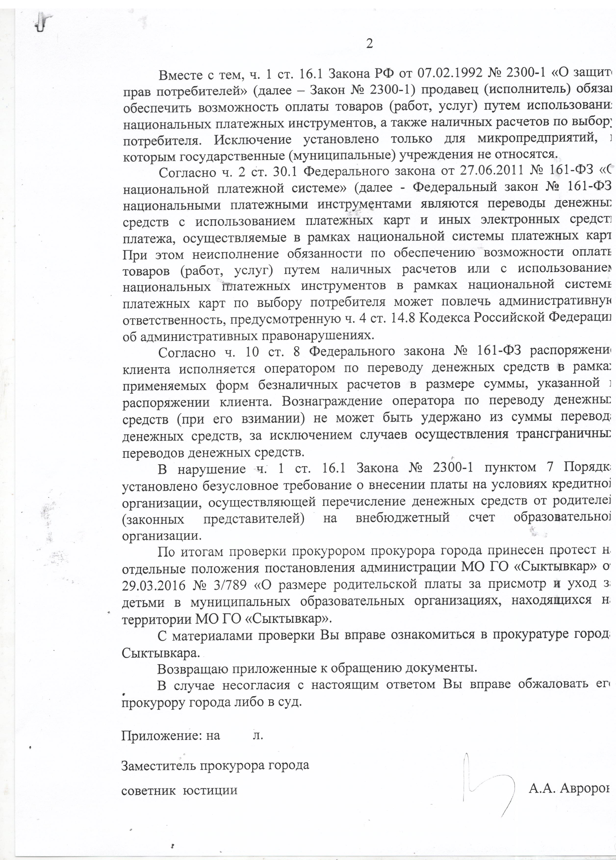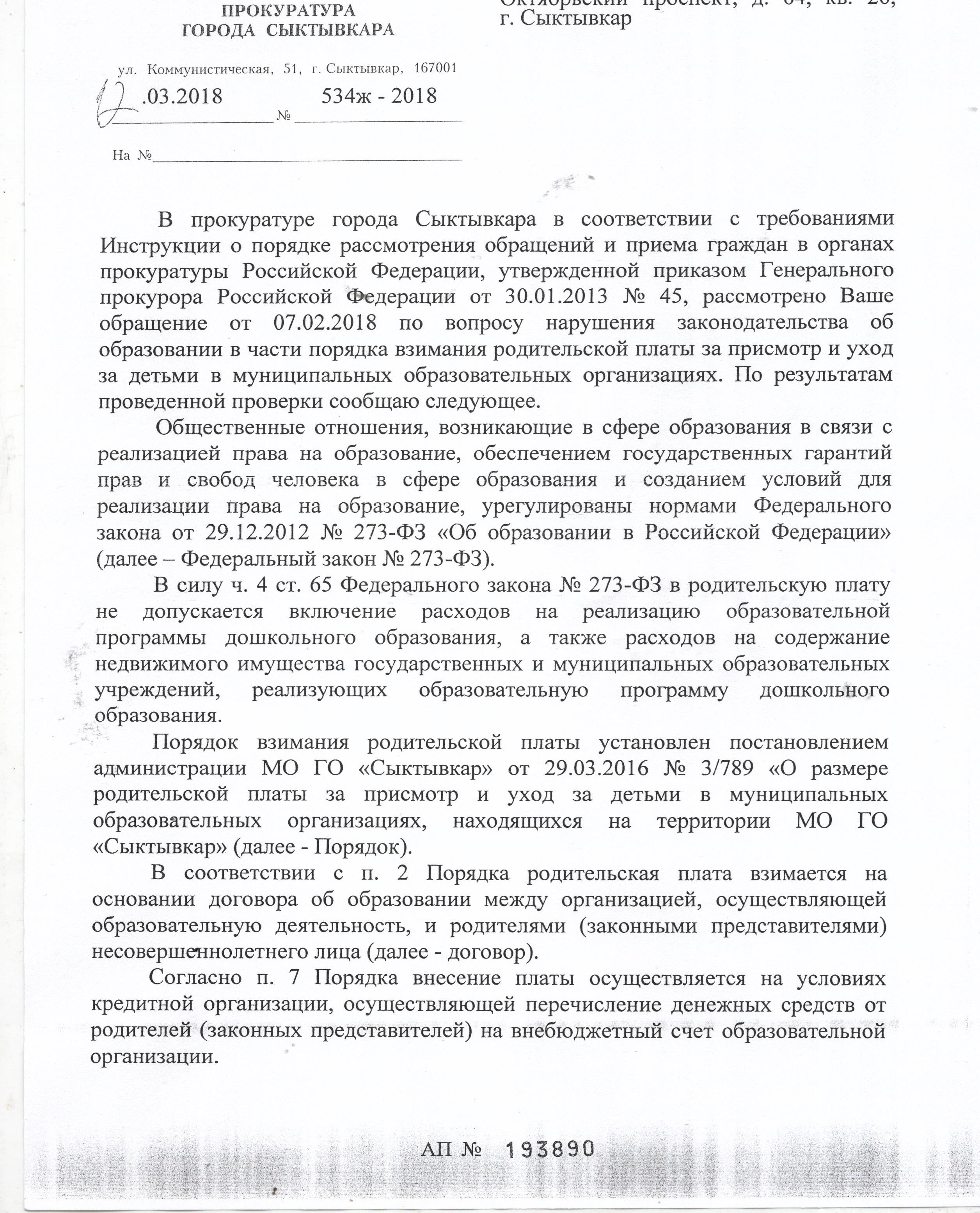 По итогам проверки прокурором г. Сыктывкар принесен протест на отдельные положения постановления администрации МО ГО "Сыктывкар" о 29.03.2016 №3/789" О размере родительской платы за присмотр и уход за детьми в муниципальных образовательных организациях, находящихся на территории МО ГО "Сыктывкар".