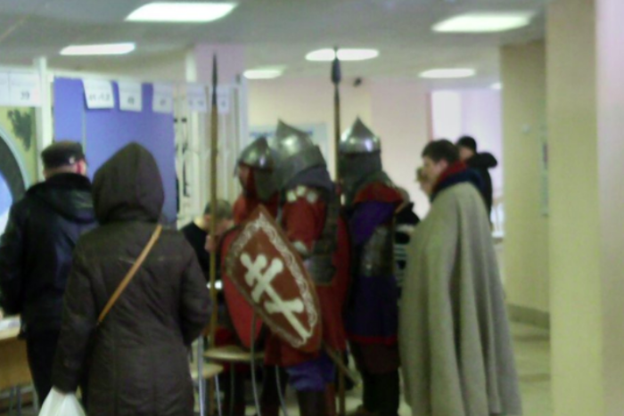 На избирательный участок в Калининском районе на улице Замшина в Петербурге пришли голосовать избиратели в костюмах рыцарей. Снимок опубликовали в твиттере наблюдатели штаба Алексея Навального.