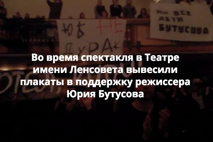 В субботу, 17 марта, в Театре имени Ленсовета прошел показ спектакля «Макбет. Кино» режиссера Юрия Бутусова, который в начале марта объявил об уходе с поста художественного руководителя театра. В конце постановки зрители вывесили баннеры с надписями «ЮБ не дурак», «Мы все дети Бутусова» и «Кипи, котел, кипи!». Актерам аплодировали стоя.