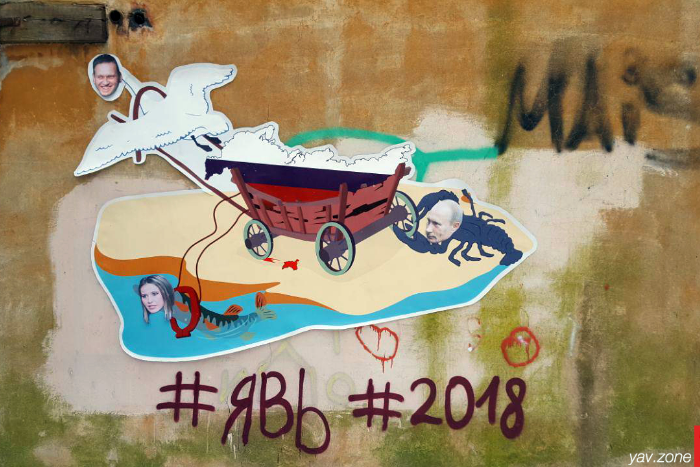 Движение «Явь» нарисовало в Петербурге работу «Лебедь, рак и щука». На нем лебедь — Алексей Навальный, рак — Владимир Путин, а щука — Ксения Собчак. Втроем они тянут в разные стороны воз, в котором находится Россия.