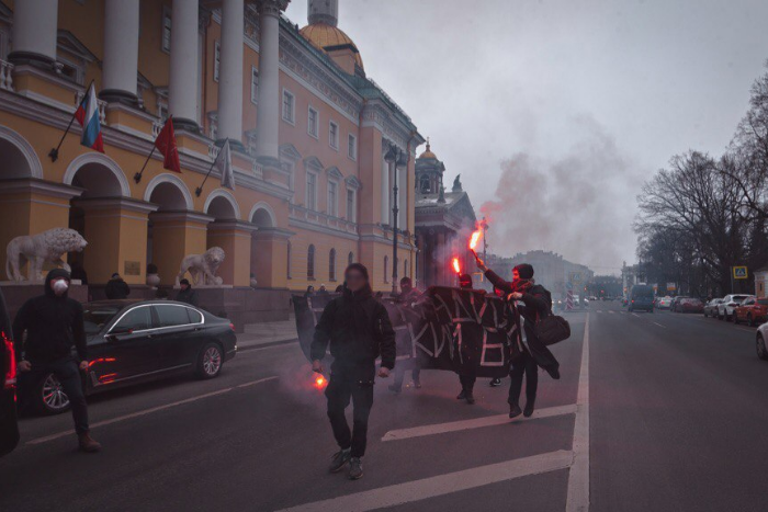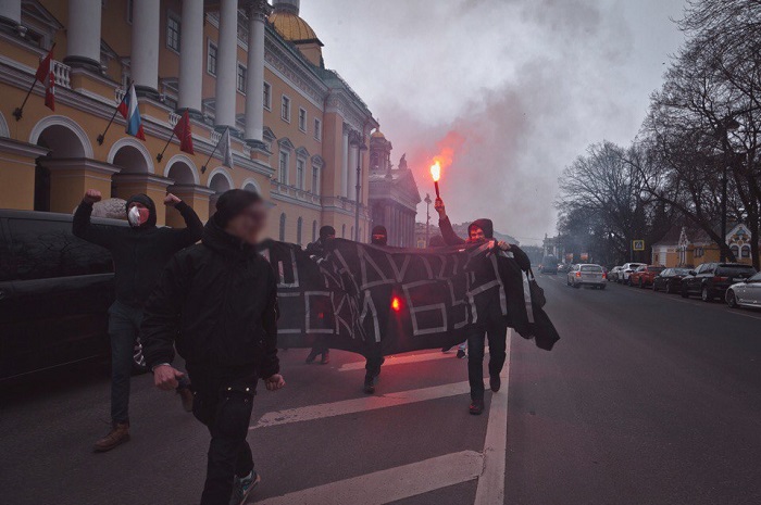 Накануне выборов президента петербургские активисты перекрыли проезжую часть у Исаакиевского собора, зажгли файеры и развернули баннер с надписью «Наш кандидат — русский бунт». По данным «ОВД Инфо», четыре человека задержаны.