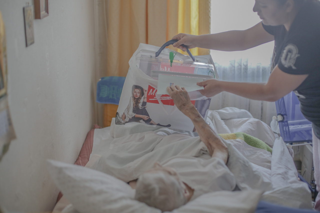 Социальный работник Альбина предлагает первым делом идти к Анне Ивановне: «Она просыпается рано. Сиделка уже звонила, говорит, что бабушка ждет». Раз ждет — значит идем. На улице морозно, в подъезде прохладно, а в квартире как будто печь натоплена — очень жарко и душно. От резкого перепада температуры кружится голова. Сиделка ведет в комнату Анны Ивановны. Там еще жарче. На кровати, которая занимает почти все небольшое пространство комнаты, лежит худенькая старушка. Ощущение, что спит. Сиделка наклоняется — зовет. Не с первого раза, но бабушка отзывается, — глуховата. «Только сесть она не сможет — слабая сегодня, — говорит сиделка. — Лежа получится проголосовать?»