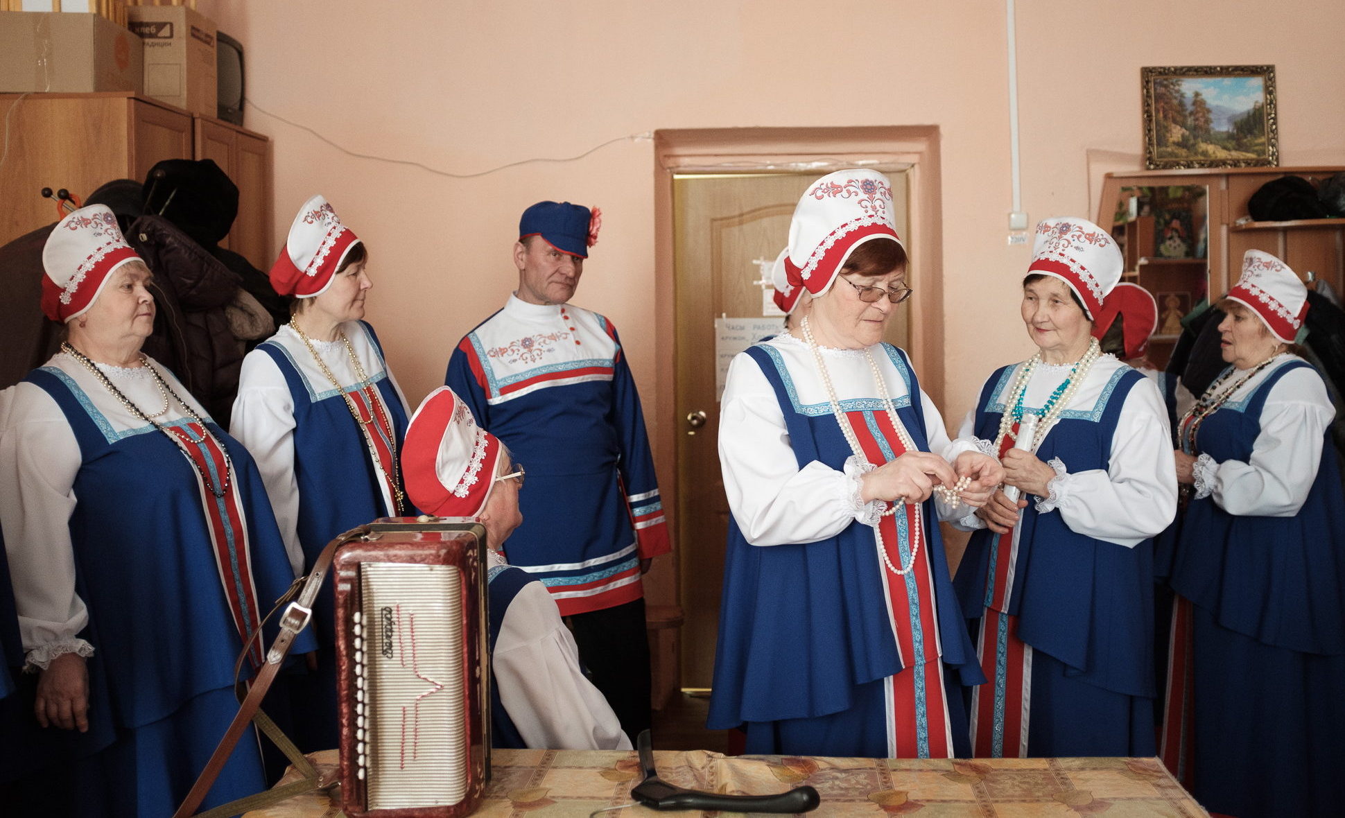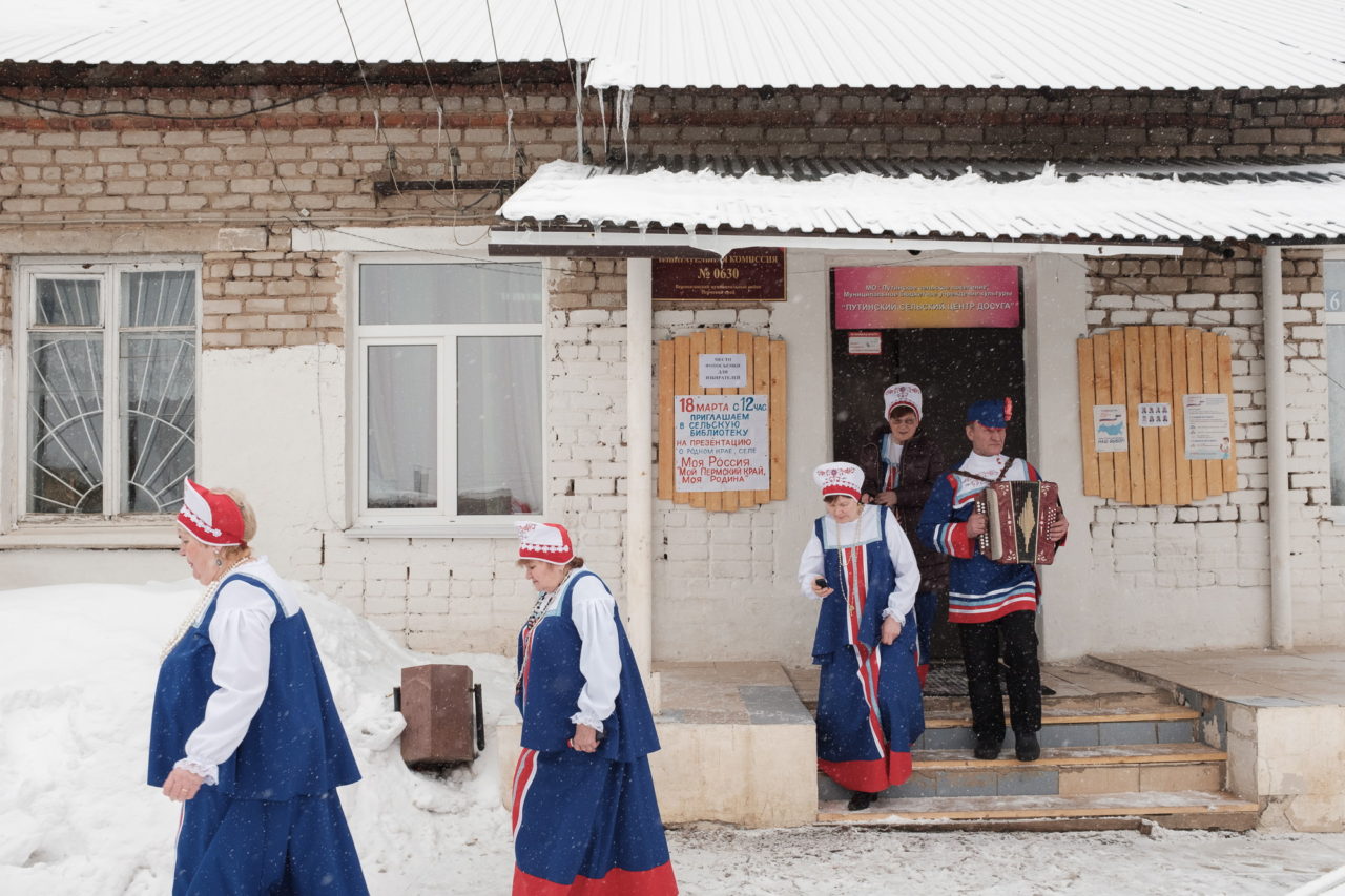 Но пьяных не много. Все голосующие — обычные люди, веселые, грустные, одинокие, с детьми и собаками, в кожаных сапогах и валенках, в ярких пуховиках и темных тулупах. Большинство не разговаривают, на вопросы о выборе смущенно отводят глаза. «Какая разница, девушка, кого я выбрал, ясно же, кто будет». И я иду в соседний кабинет на звук гармони — гармонист-кочегар настраивает инструмент перед концертом. Артистки вокальной группы «Берегиня», в основном пенсионерки, наряжаются для выступления. Народные костюмы цветов флага России, бусы, помада, кокошники. Все уже проголосовали за Путина, осталось только петь.