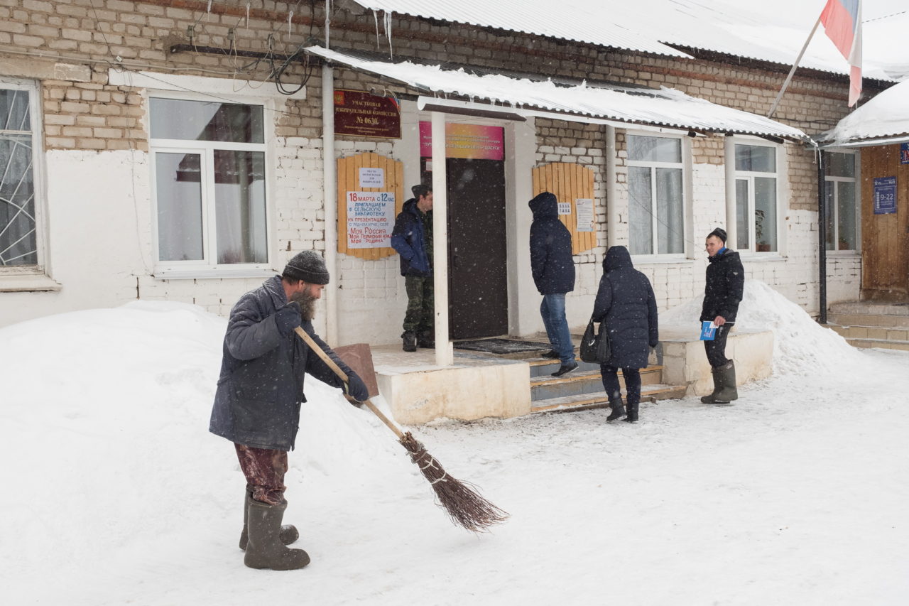 «С пра-а-а-зднико-о-м!» — кричит нетрезвый мужчина в валенках, заправленных в спортивные штаны. «Наша родина Росси-и-я-я-я!» — женщина в серой дубленке, кружась, заходит на участок. Петь перестает, когда переступает порог УИКа.