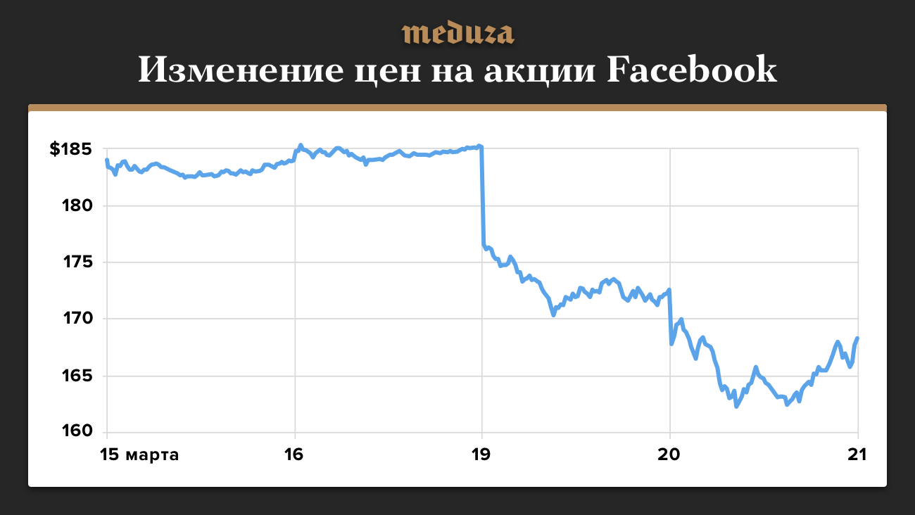 Вечером в пятницу, 16 марта, акции Facebook стоили 189 долларов. В выходные The Guardian и The New York Timesопубликовали расследования о деятельности компании Cambridge Analytica, которая собрала данные о 50 миллионах пользователей соцсети без их ведома. Уже к вечеру вторника, 20 марта, акции Facebook стали стоить 167 долларов. Социальная сеть теперь стоит меньше 500 миллиардов долларов. Для сравнения: Berkshire Hathaway стоит 507 миллиардов долларов, Microsoft — 717 миллиардов, Alphabet, он же Google — 761 миллиард, Amazon — 768 миллиардов, Apple — 889 миллиардов.