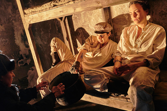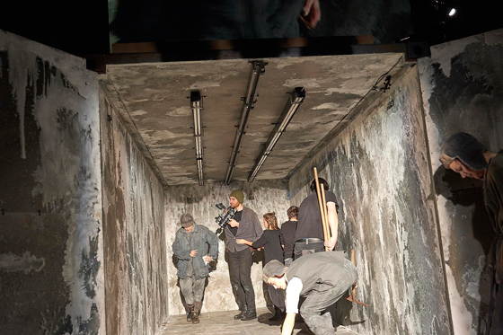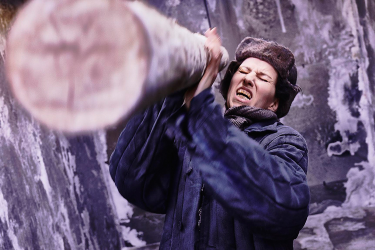 © Matthias Horn Тут надо, вероятно, пояснить, что Residenztheater при всем своем статусе — это все еще очень актерский театр, что для Германии как страны победившей активной режиссуры уже не очень характерно, а потому по-своему очень ценно. В Resi, как его ласково называют мюнхенцы, несмотря на обилие крупных режиссерских имен в афише, и публика, и труппа по-прежнему ценят момент прямого общения актера и зала — с пресловутой «энергетикой», которая напрямую хлещет в зал во время пространных монологов. Все это Кулябин безжалостно отнял у шести своих актрис вместе с голосом, гендером (поскольку они играют мужчин) и самой возможностью увидеть перед собой и «пробить» зрительный зал. Однако именно эта пораженность в актерском инструментарии невероятно укрупняет в кадре каждый микрожест, поворот головы, вдруг обмякшую спину в драном ватнике, полуобмороженные костяшки пальцев, которые стучат и соскальзывают с бревна на плече. Крупные планы, конечно, есть — и вполне выдающиеся по актерской выразительности (не в последнюю очередь потому, что их мало). Но большую часть времени актрисы проводят в контейнере в ролях ботинок, рукавов, спин или даже плохонького размытого фонарика, скачущего по лицам. Фонарик, очевидно, тоже роль — он берет на себя функции отбора того, что показать зрителю, а значит, как и оператор, тоже является рассказчиком.