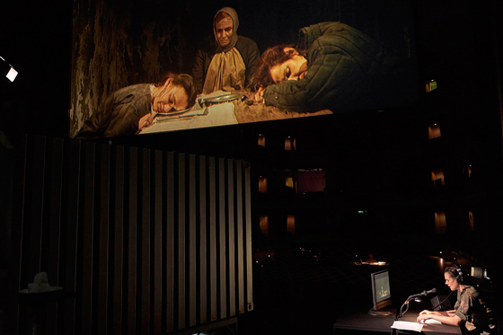 На мониторе компьютера чтеца — та же картинка, которую видит зритель на большом экране. Внутренность контейнера, покрытая изморозью, а в ней — лишенные пола и голоса существа в характерных ватниках или вертухайской форме (художник по костюмам — Галя Солодовникова). Вместе с ними в контейнере — единственный оператор Давид Мюллер: в его распоряжении одна ручная и две стационарные камеры, которыми он манипулирует еще и как режиссер монтажа. Камера — равноправный нарратор в спектакле Кулябина, предлагающий свой, очень плотный, далеко не всегда прямой видеокомментарий к звучащему со сцены тексту рассказов.