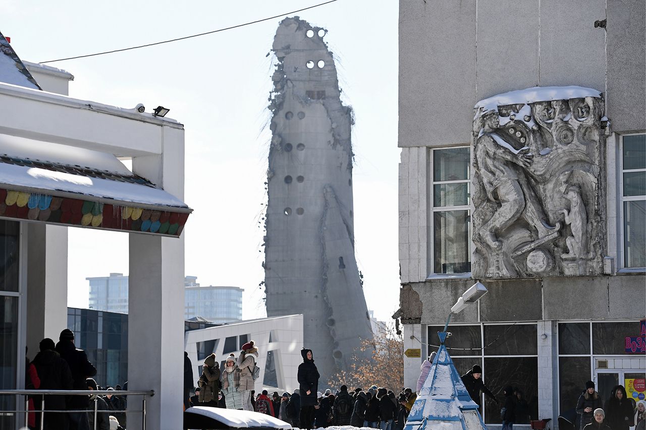 Полиция начала перекрывать улицы в квартале возле телебашни за два часа до взрыва, намеченного на 9 утра субботы. Было холодно — минус 17, но горожане все равно вышли на улицы посмотреть на снос. Возле синагоги, расположенной всего в 250 метрах от недостроя, уже к 7:30 утра было не меньше 50 человек, к 9 утра — больше 100. Остальные толпились на мостах, площадях и в переулках, откуда, по их мнению, открывался лучший обзор.