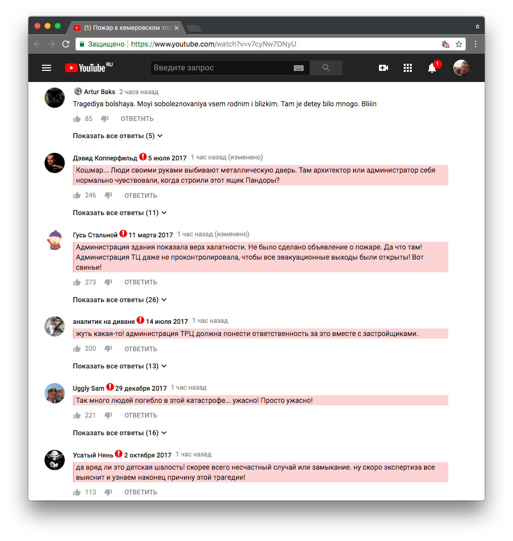 Пользователи соцсетей обнаружили аномально высокое количество дизлайков (отметок «Мне не понравилось») у роликов, связанных с пожаром в торговом центре «Зимняя вишня» в Кемерово. На ютьюбе такое обычно происходит с видео, содержащими критику власти, — в первую очередь с роликами политика Алексея Навального. В комментариях к видео из Кемерово пользователи также обнаружили массу «кремлеботов».
