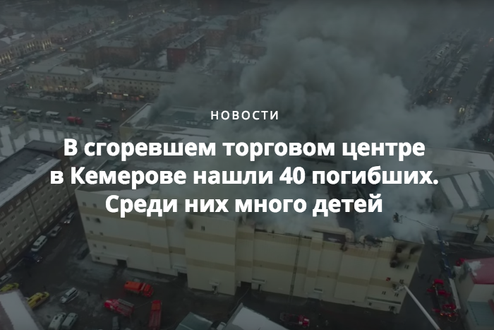 Спасатели обнаружили тела как минимум 40 погибших в торговом центре «Зимняя вишня» в Кемерове, который загорелся днем 25 марта. Число погибших возросло, когда пожарные смогли проникнуть в заблокированные кинозалы на четвертом этаже. Большинство погибших там — дети.