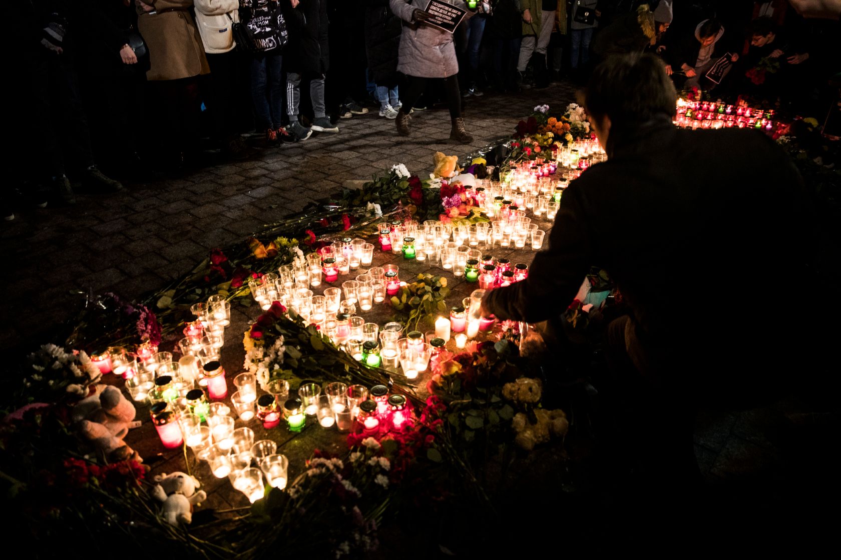 Около девяти вечера кто-то предложил устроить минуту молчания — не сразу, но собравшимся удалось добиться тишины. После этого молодые люди, разложившие свечки на гранитной плитке, попросили собравшихся перенести все цветы и лампады к постаменту памятника Пушкину.