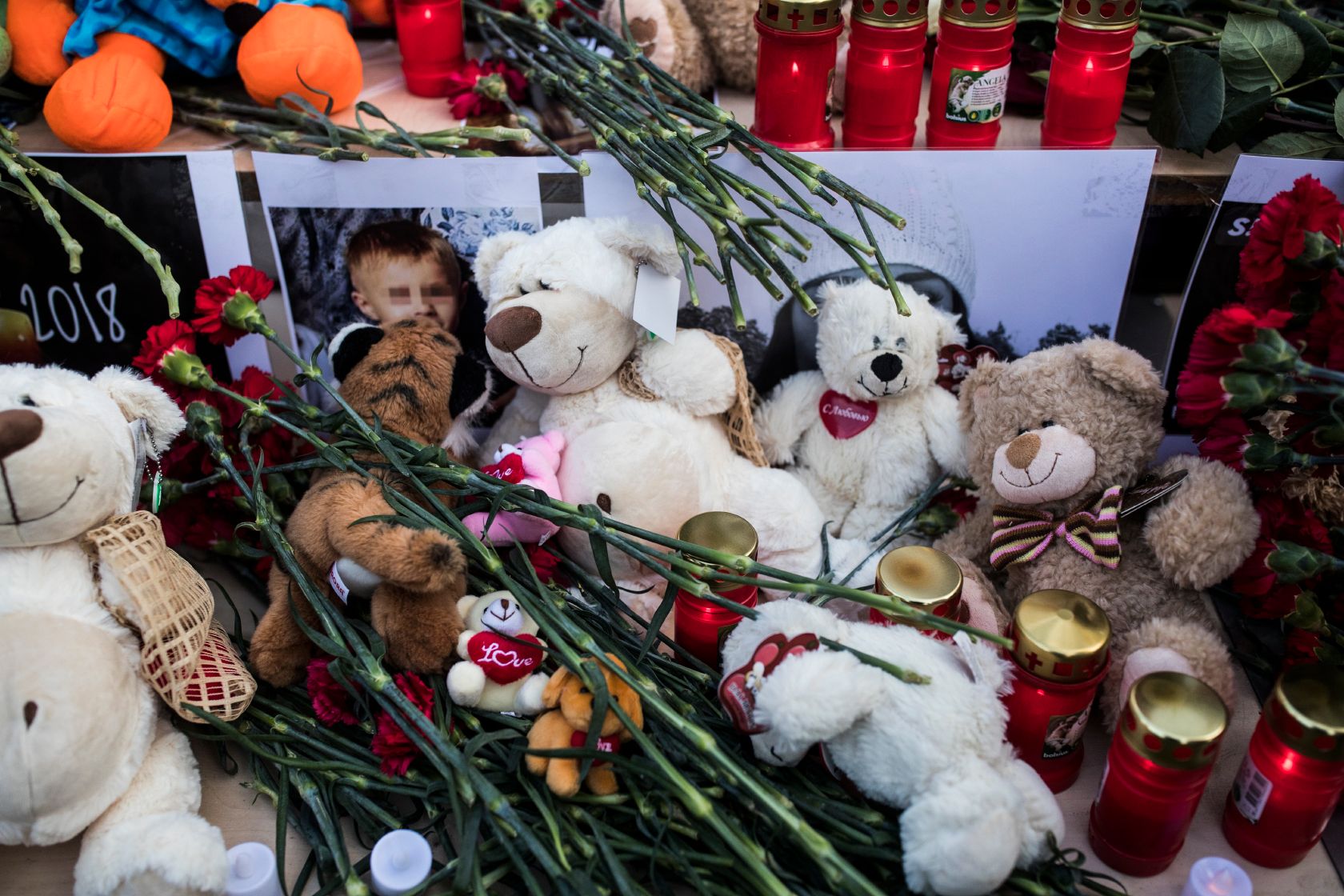 По всей видимости, акцию на Манежной готовили в спешке — мэрия сообщила о ней лишь в час дня, а в начале шестого, когда мероприятие уже официально началось, организаторы еще натягивали баннер с надписью «Кемерово, мы с тобой». Перед ним на длинном постаменте лежали мягкие игрушки с магазинными бирками на ушах, красные гвоздики, стояли лампадки, с которых не успели снять этикетки, и фотографии детей с заблюренными лицами.
