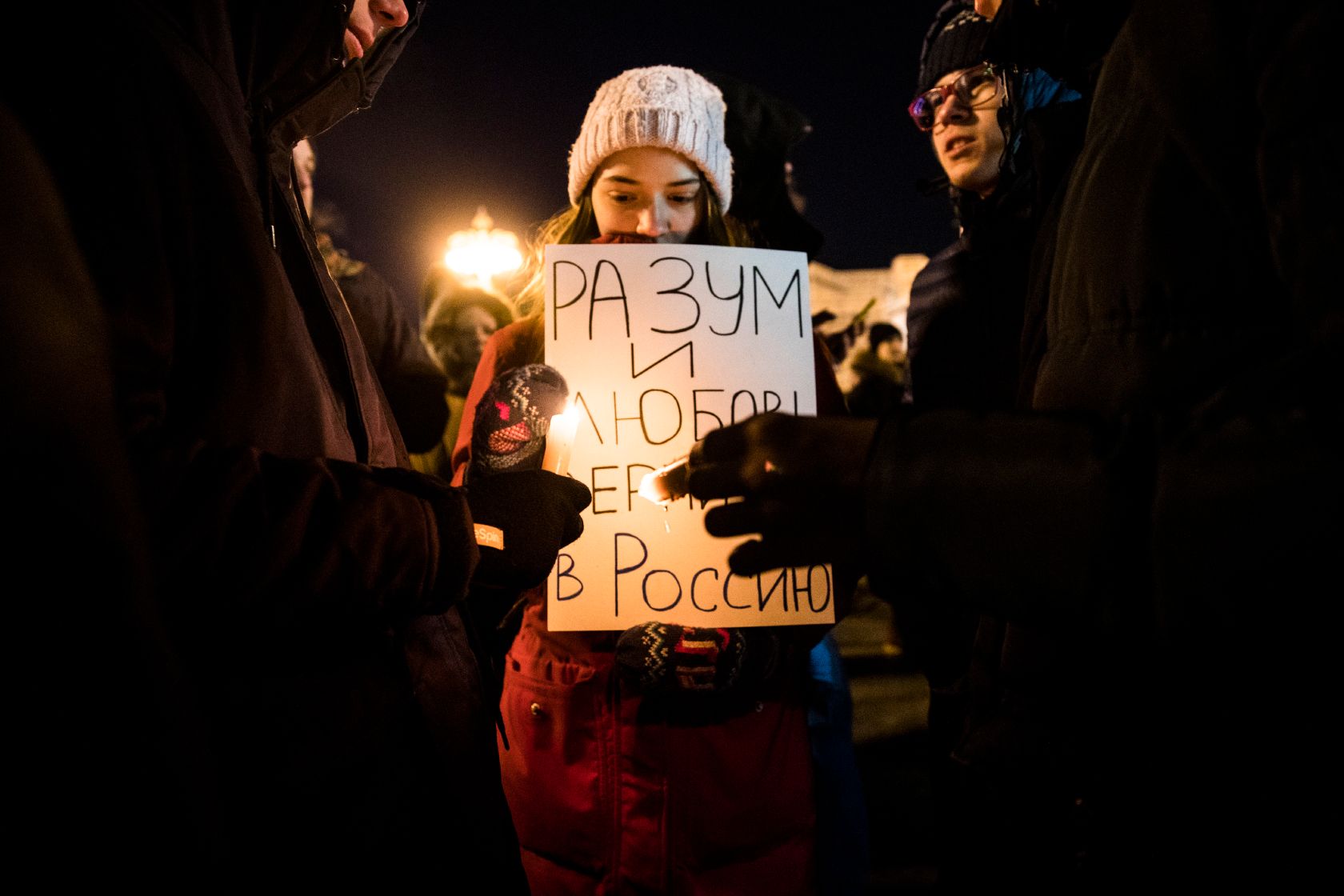 «Передавайте зажигалки», — попросили активисты. Вместе с зажигалками над головами стали передавать цветы. Кто-то раздавал черные листы с датой «25.03.18» и надписью «Помним», некоторые зажгли в руках церковные восковые свечи. В небо полетели белые шары. На какое-то время в толпе появились Алексей Навальный с женой Юлией, политики Григорий Явлинский и Дмитрий Гудков; они не давали комментариев и пытались раствориться в толпе.