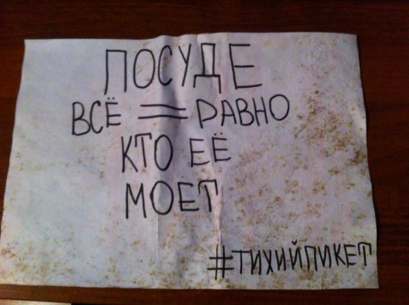 Моя любимая история — про потерянный плакат. Девушка ездила с плакатом про феминизм и гендерные стереотипы. Что немытой посуде не важно, какого ты пола. Она писала отчет в паблик, писала, что потеряла плакат, когда бежала (был ветер, дождь). Через несколько дней в группе «Подслушано МГУ»во ВКонтакте появился пост: «Сегодня видела около поворота на эконом парня с листом, прикрепленным к рюкзаку, и надписью на нем «Посуде все равно, кто ее моет» #тихийпикет Ты крут. Если кто-то думает, что такими способами ничего не решается и не изменяется, я говорю: меня это вдохновило. Я уважаю тех, кто пропагандирует гендерное равноправие, и мне приятно видеть, что люди в студенческой среде имеют смелость не молчать об этом, пусть даже в форме тихого пикета. Удачи тебе».